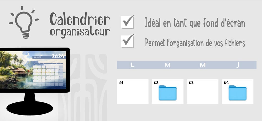 Avec ces 12 pages de calendrier faites pour se mettre en fond d'écran de bureau d'ordinateur, vous aurez la possibilité de vous organiser tout au long de l'année avec ambiance polynésienne assurée !