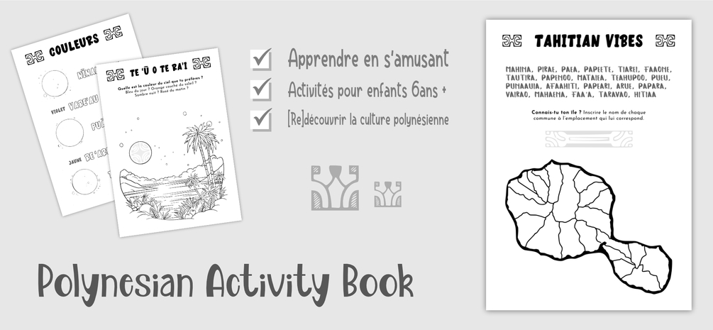 Un moment de détente devant vous ou bien un moment à partager avec vos enfants ? Renforcez vos bases du tahitien en vous amusant avec ce carnet d'activité de 24 pages qui contient plusieurs jeux tels que du coloriage d'images du Fenua, des cartes de la Polynésie à connaître, des fleurs tropicales à découvrir, un paysage polynésien à fabriquer, apprendre les couleurs en tahitien avec le ciel à réinventer, une maison à sauver d'une invasion de crabe, la recette du poisson cru à déchiffrer et plein d'autres activités encore !